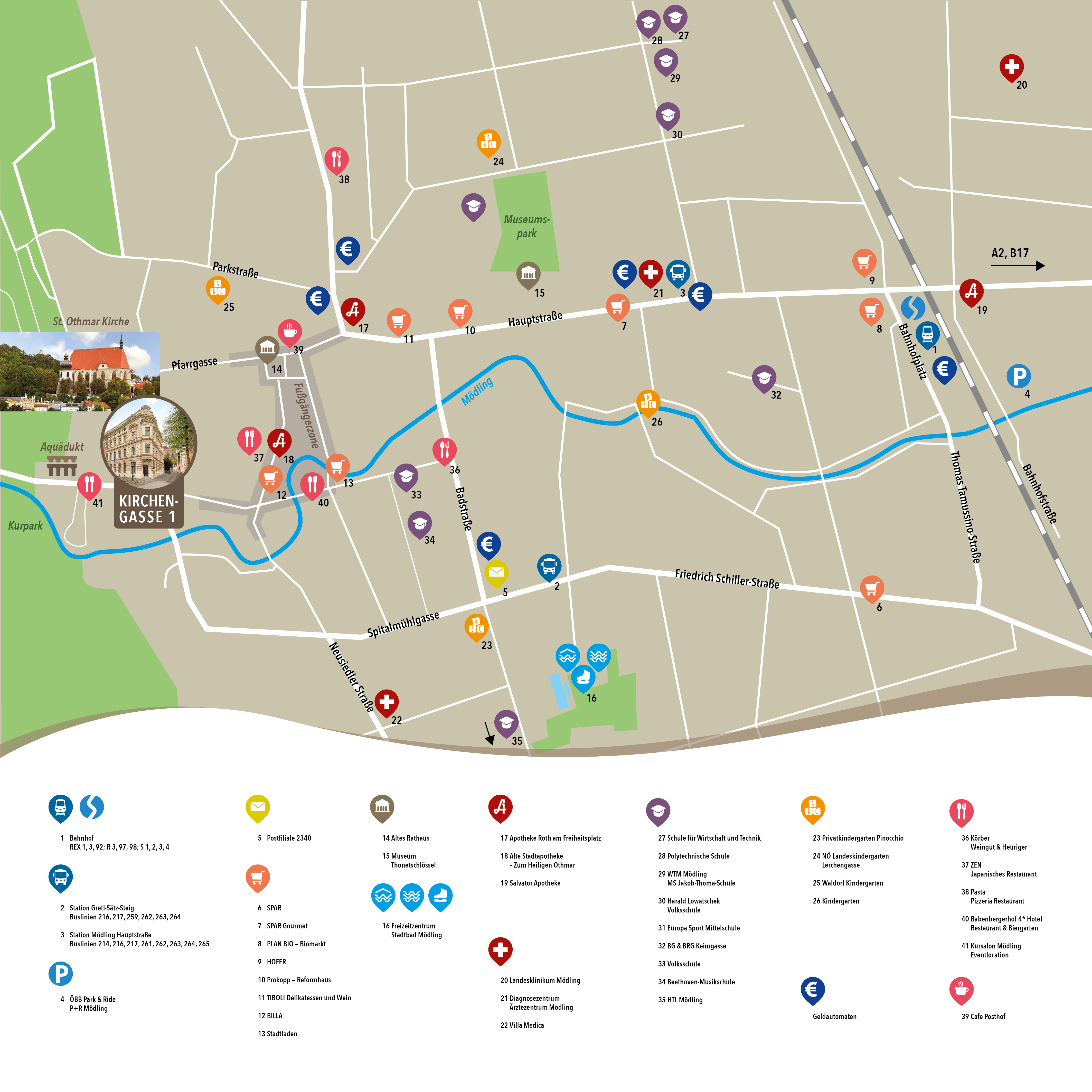 Nur wenige Schritte vom historischen Aquädukt entfernt beginnt hier das Leben in der Kirchengasse. Fußgängerzone, Cafés, Kurpark und Wienerwald vereinen hier Urbanität & Natur.